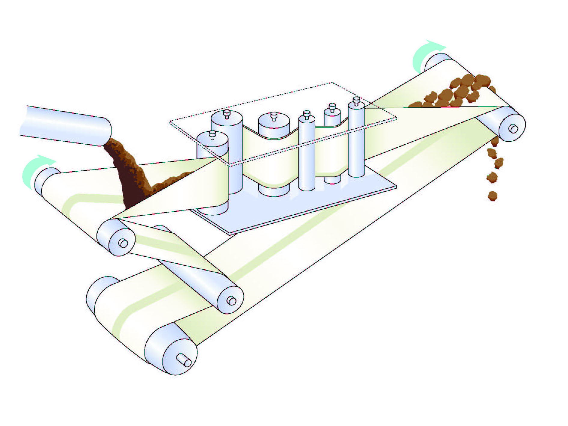 Sludge dewatering systems such as folding belt presses dewater sludge as the belt folds along the centre to form a V-shaped cavity. Sludge is squeezed as it passes around a series of vertical rollers where pressure and shear form a filter cake. Folding belt presses are forgiving of variations in feed composition that can upset other types of dewatering devices.